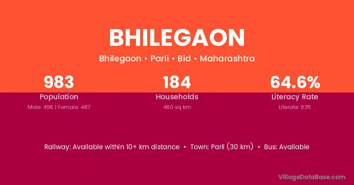 Parli (30 km) is the nearest town to Bhilegaon village for major economic activities and is located approximately 30 km away.