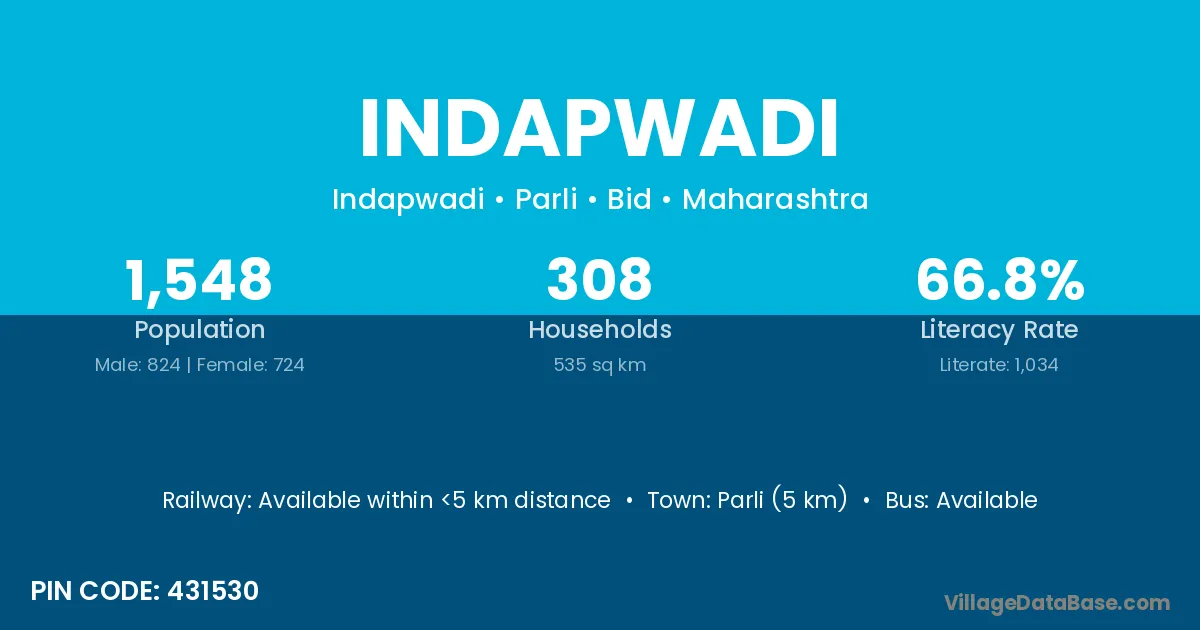 Parli (5 km) is the nearest town to Indapwadi village for major economic activities and is located approximately 5 km away.