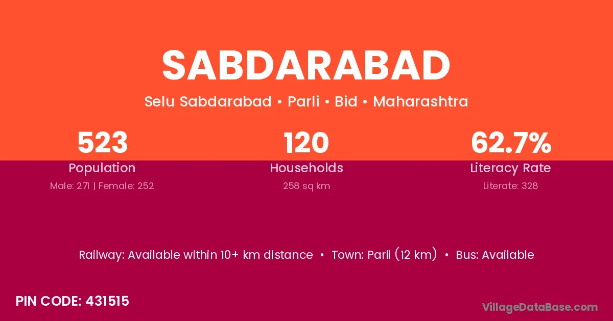 Parli (12 km) is the nearest town to Sabdarabad village for major economic activities and is located approximately 12 km away.