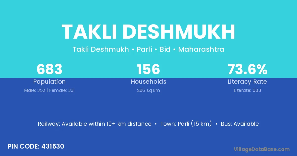 Parli (15 km) is the nearest town to Takli Deshmukh village for major economic activities and is located approximately 15 km away.