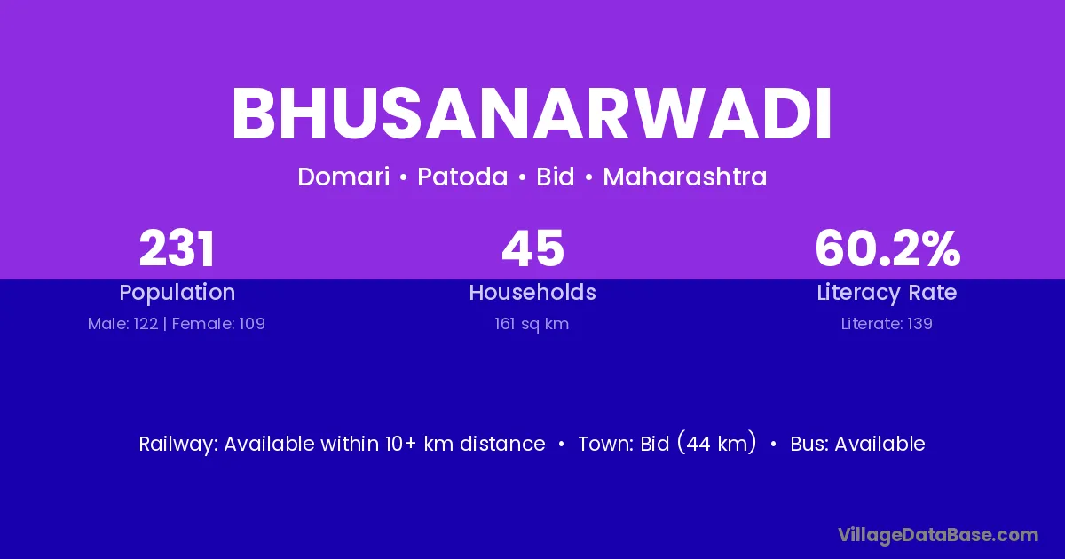Bhusanarwadi village has a total population of 231 people, of which 122 are males and 109 are females.