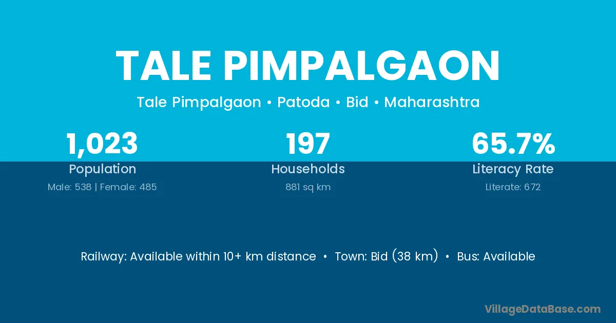 Bid (38 km) is the nearest town to Tale Pimpalgaon village for major economic activities and is located approximately 38 km away.