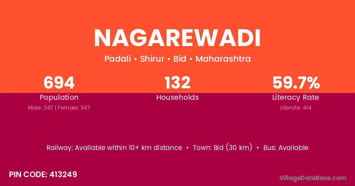 Nagarewadi village has a total population of 694 people, of which 347 are males and 347 are females.
