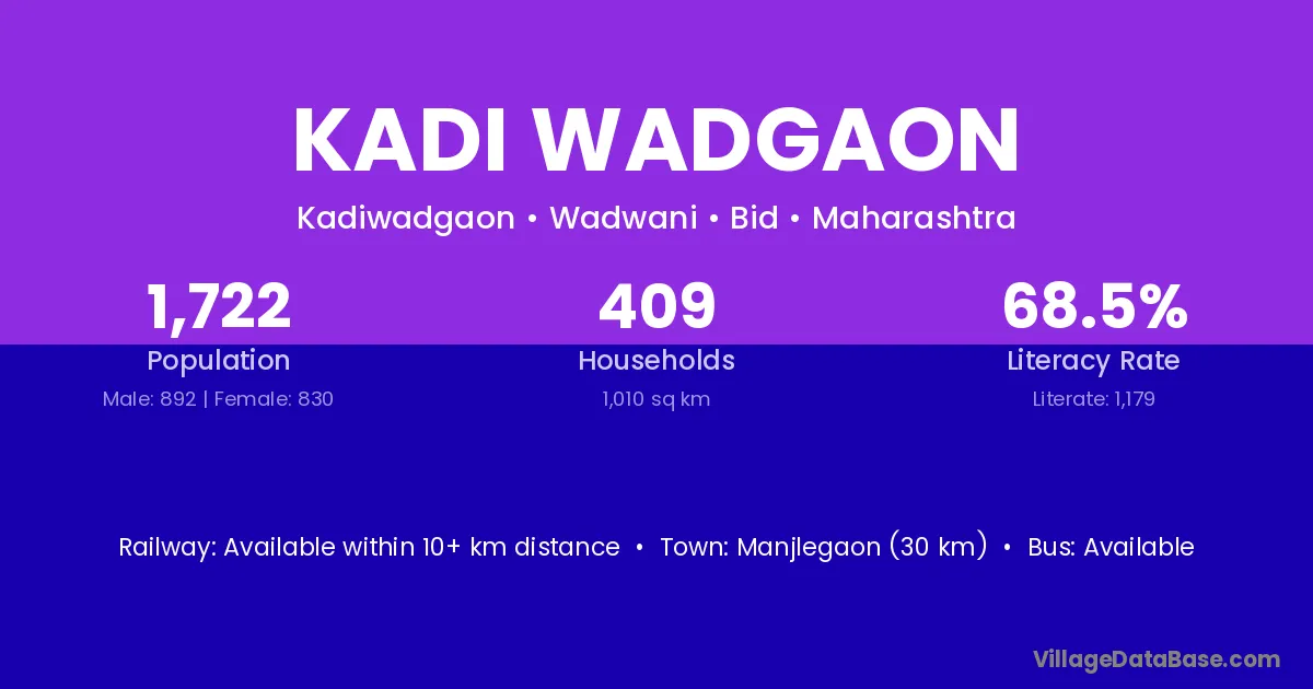 Manjlegaon (30 km) is the nearest town to Kadi Wadgaon village for major economic activities and is located approximately 30 km away.