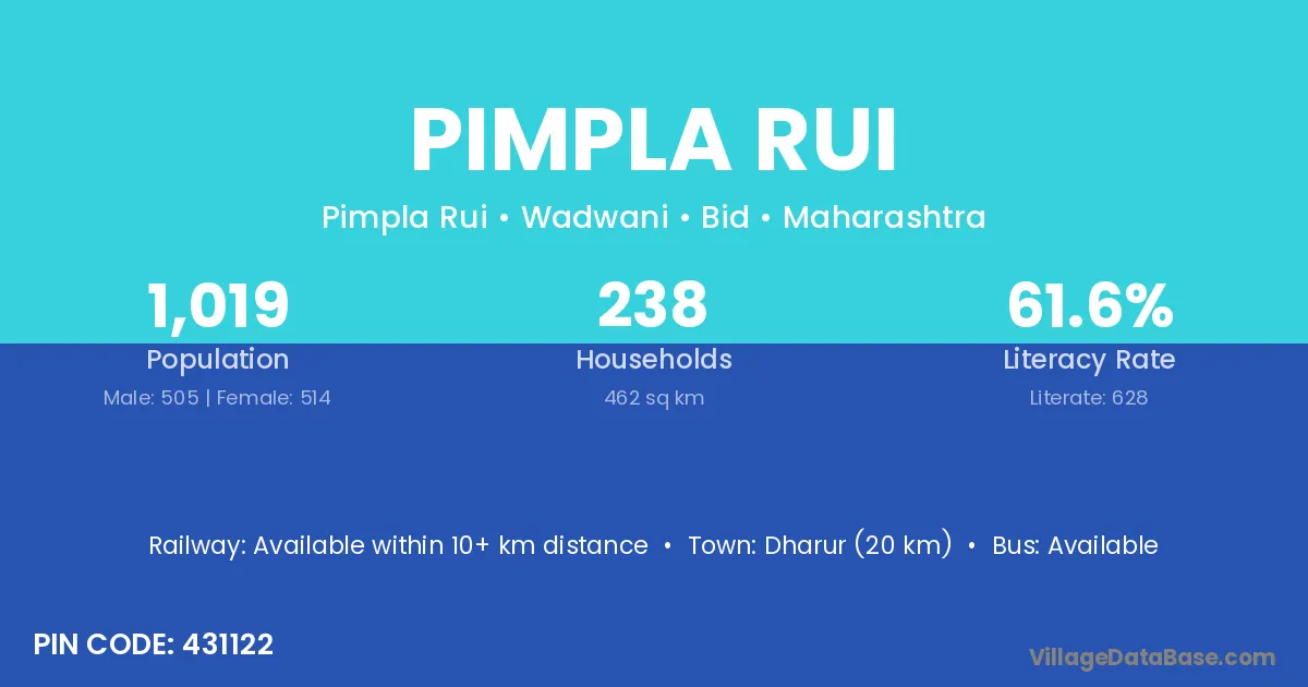 Dharur (20 km) is the nearest town to Pimpla Rui village for major economic activities and is located approximately 20 km away.