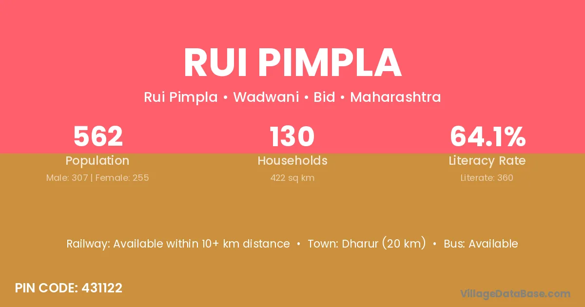 Dharur (20 km) is the nearest town to Rui Pimpla village for major economic activities and is located approximately 20 km away.