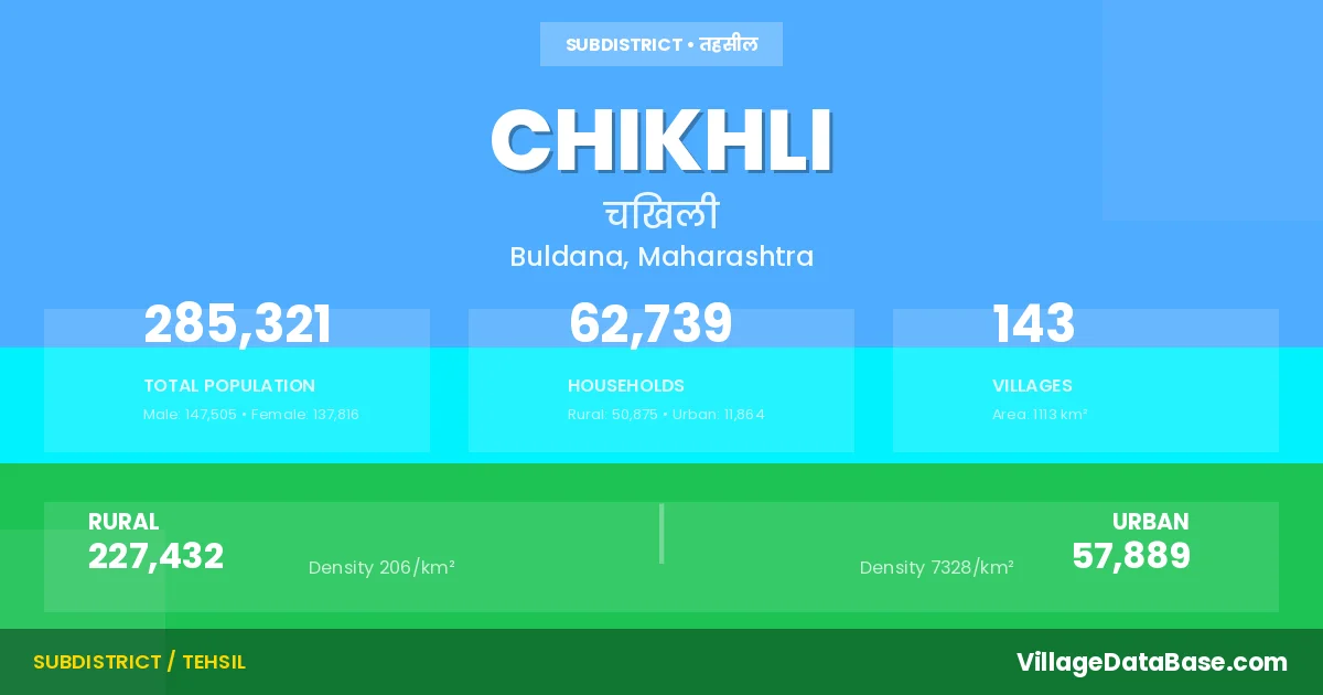 According to the 2011 census The total area of Chikhli Tehsil is 1113 km², with a population of 285321 people. The population density is 256 inhabitants per square kilometre, and there are approximately 62739 houses in the sub district.