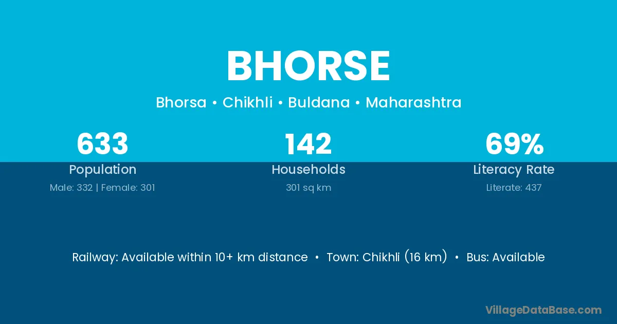 Chikhli (16 km) is the nearest town to Bhorse village for major economic activities and is located approximately 16 km away.