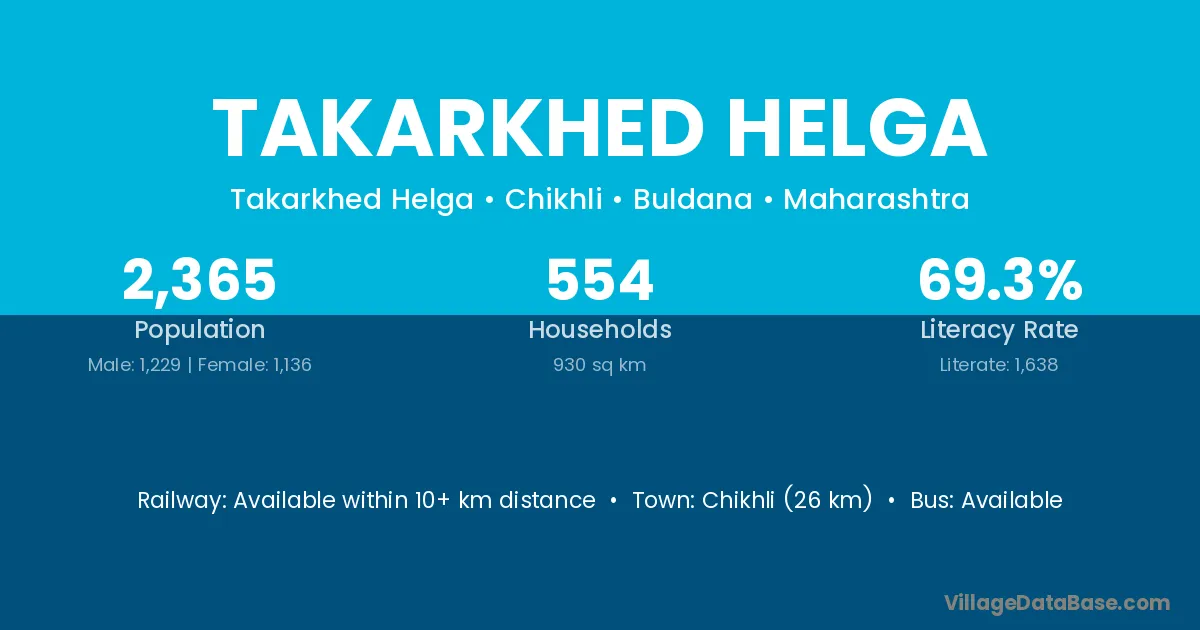 Chikhli (26 km) is the nearest town to Takarkhed Helga village for major economic activities and is located approximately 26 km away.