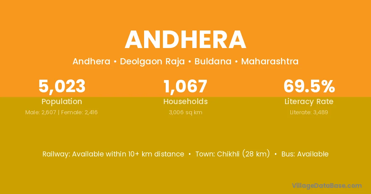 Chikhli (28 km) is the nearest town to Andhera village for major economic activities and is located approximately 28 km away.