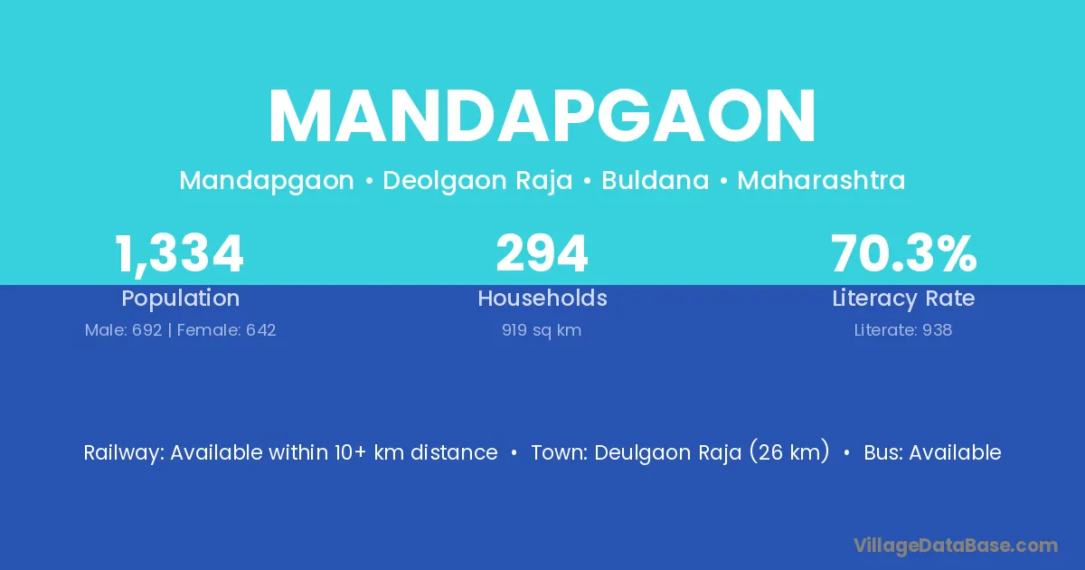Deulgaon Raja (26 km) is the nearest town to Mandapgaon village for major economic activities and is located approximately 26 km away.