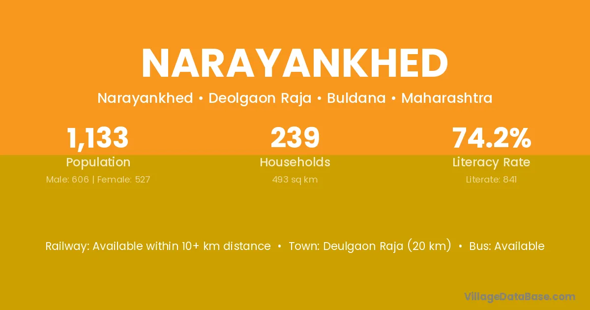 Deulgaon Raja (20 km) is the nearest town to Narayankhed village for major economic activities and is located approximately 20 km away.