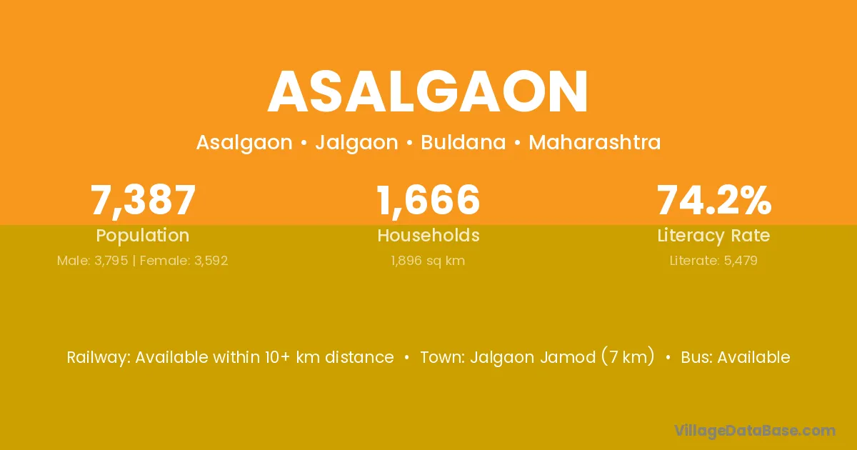 Jalgaon Jamod (7 km) is the nearest town to Asalgaon village for major economic activities and is located approximately 7 km away.