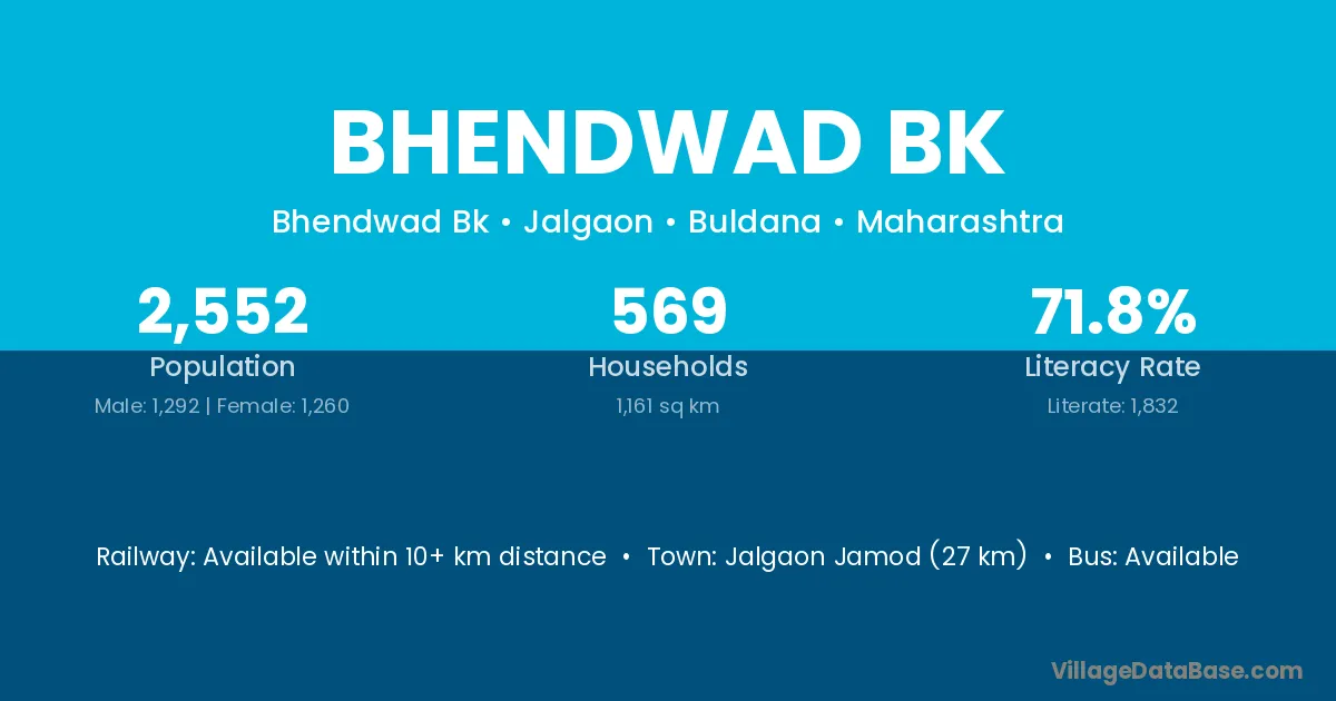 Jalgaon Jamod (27 km) is the nearest town to Bhendwad Bk village for major economic activities and is located approximately 27 km away.