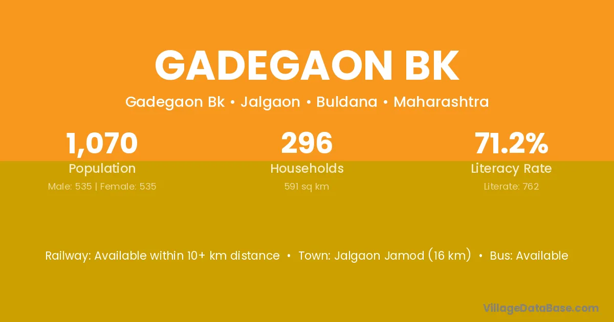 Jalgaon Jamod (16 km) is the nearest town to Gadegaon Bk village for major economic activities and is located approximately 16 km away.