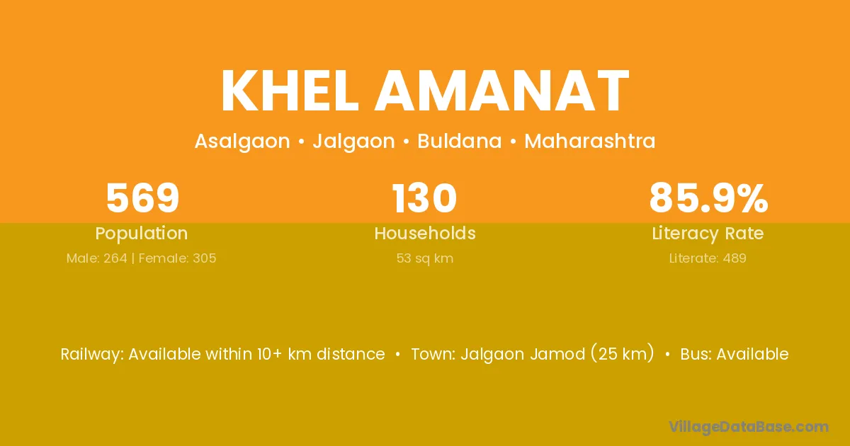 Jalgaon Jamod (25 km) is the nearest town to Khel Amanat village for major economic activities and is located approximately 25 km away.