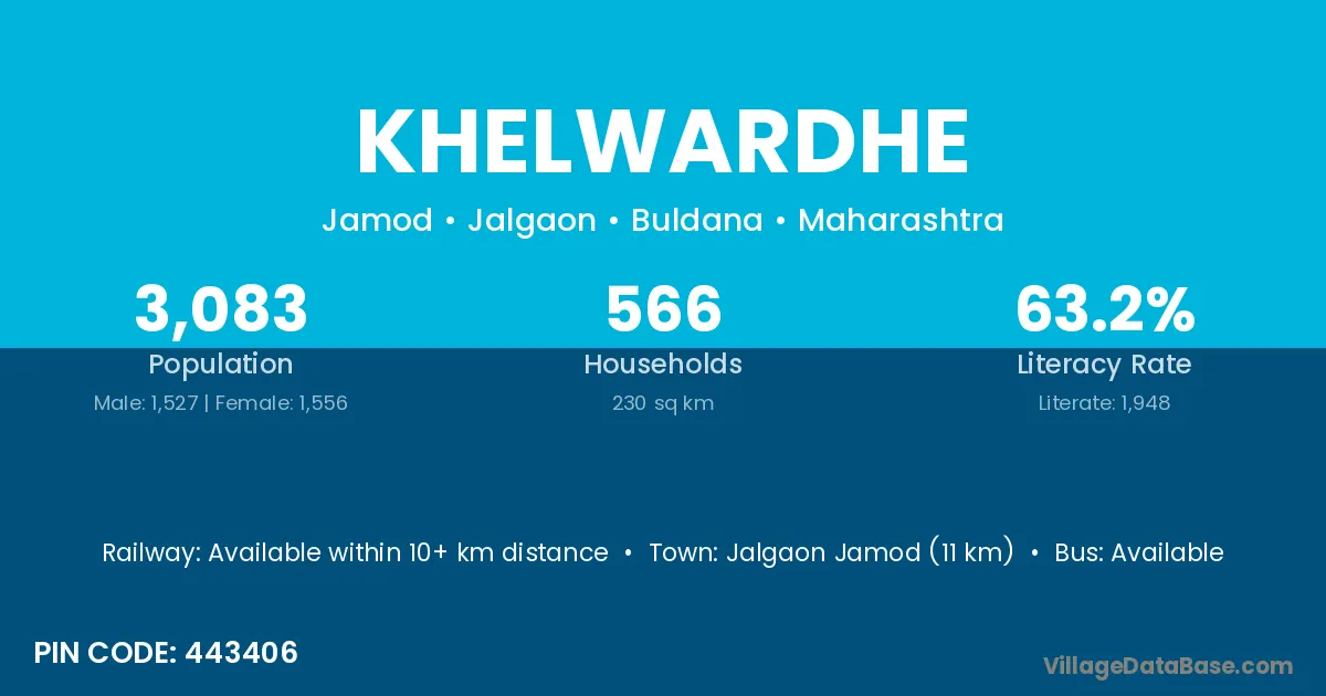 Jalgaon Jamod (11 km) is the nearest town to Khelwardhe village for major economic activities and is located approximately 11 km away.