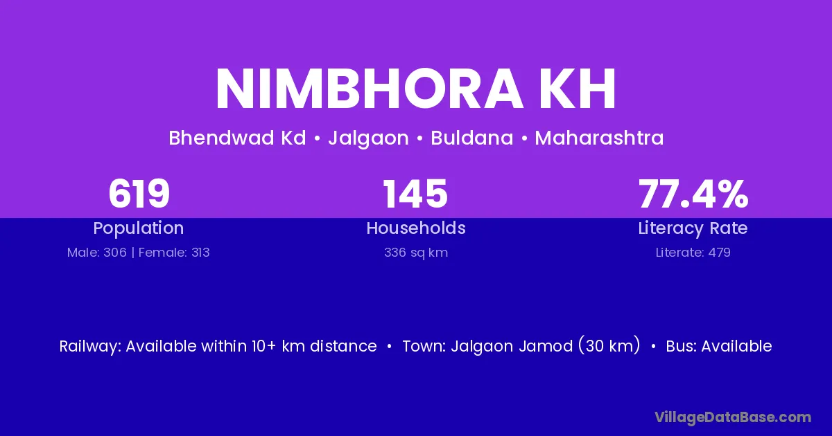 Jalgaon Jamod (30 km) is the nearest town to Nimbhora Kh village for major economic activities and is located approximately 30 km away.