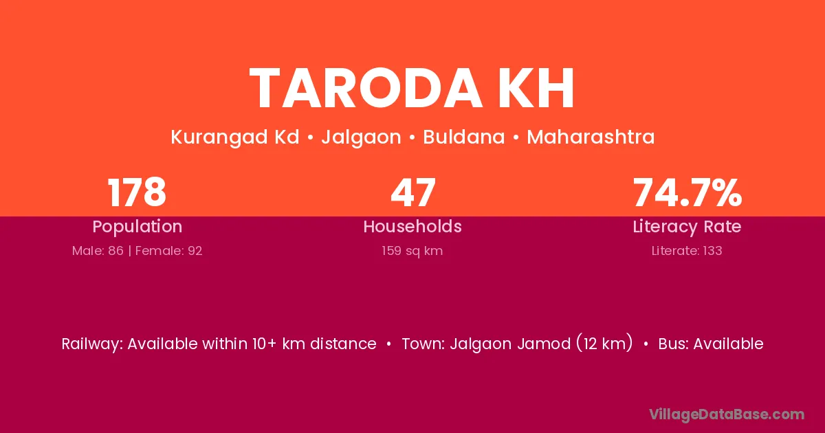 Jalgaon Jamod (12 km) is the nearest town to Taroda Kh village for major economic activities and is located approximately 12 km away.