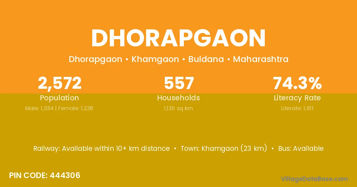 Khamgaon (23 km) is the nearest town to Dhorapgaon village for major economic activities and is located approximately 23 km away.