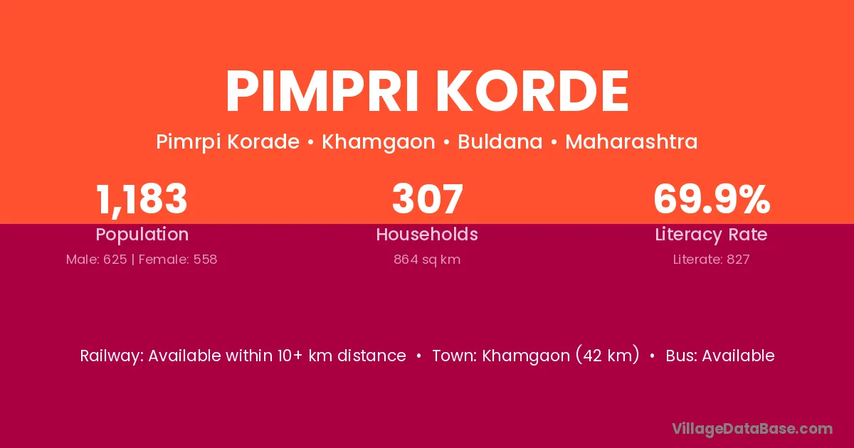 Khamgaon (42 km) is the nearest town to Pimpri Korde village for major economic activities and is located approximately 42 km away.