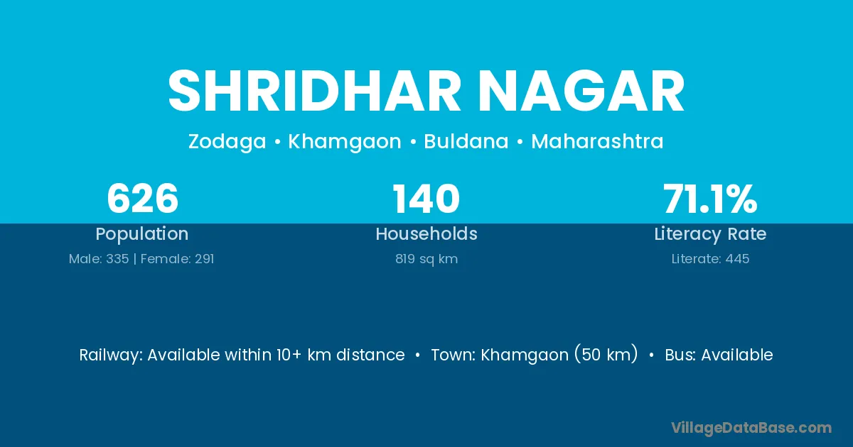 Khamgaon (50 km) is the nearest town to Shridhar Nagar village for major economic activities and is located approximately 50 km away.