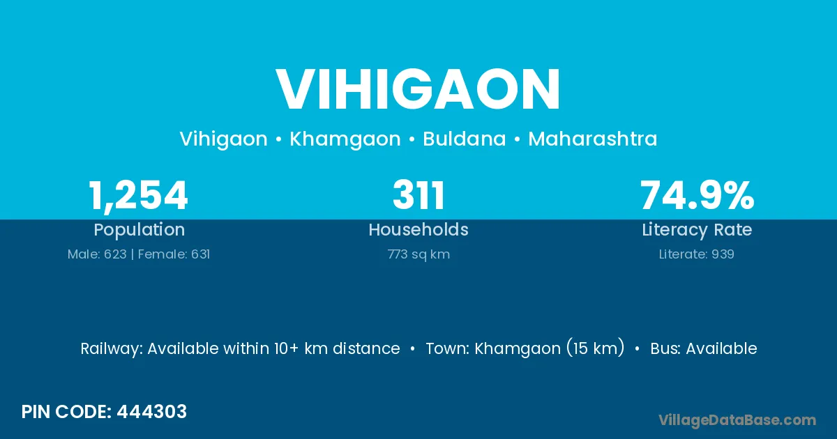 Khamgaon (15 km) is the nearest town to Vihigaon village for major economic activities and is located approximately 15 km away.