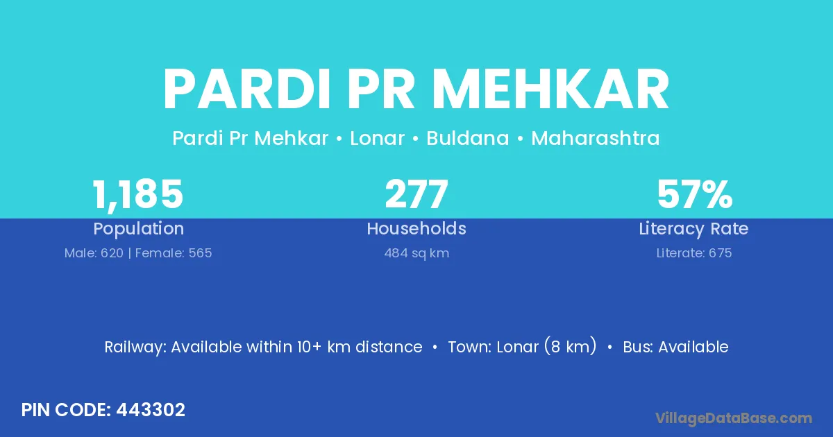 Pardi Pr Mehkar village has a total population of 1,185 people, of which 620 are males and 565 are females.