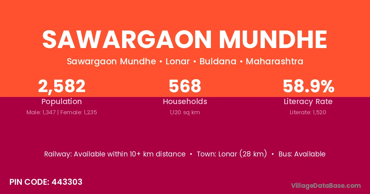 Lonar (28 km) is the nearest town to Sawargaon Mundhe village for major economic activities and is located approximately 28 km away.