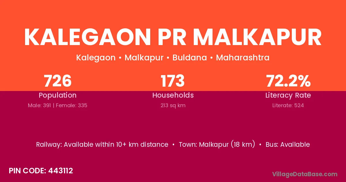 Kalegaon Pr Malkapur village has a total population of 726 people, of which 391 are males and 335 are females.