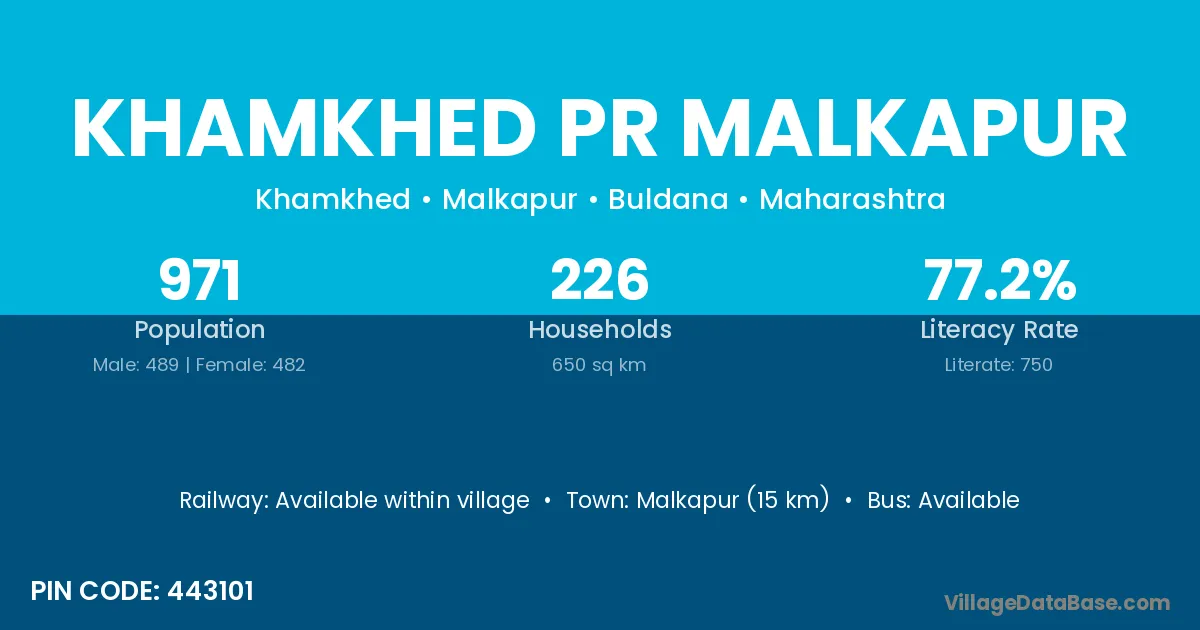 Khamkhed Pr Malkapur village has a total population of 971 people, of which 489 are males and 482 are females.