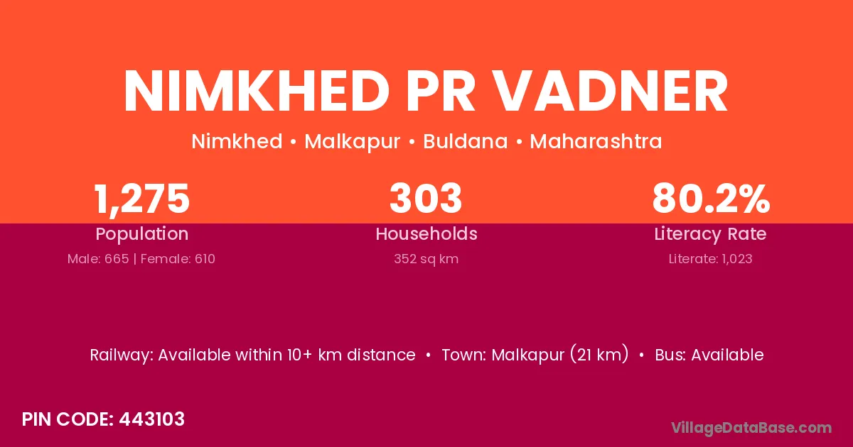 Malkapur (21 km) is the nearest town to Nimkhed Pr Vadner village for major economic activities and is located approximately 21 km away.