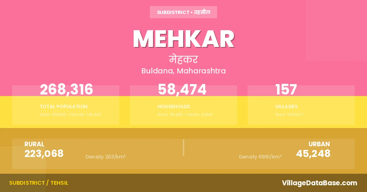 According to the 2011 census The total area of Mehkar Tehsil is 1108 km², with a population of 268316 people. The population density is 242 inhabitants per square kilometre, and there are approximately 58474 houses in the sub district.