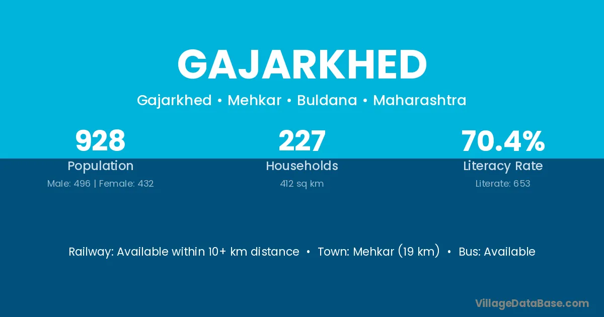 Mehkar (19 km) is the nearest town to Gajarkhed village for major economic activities and is located approximately 19 km away.