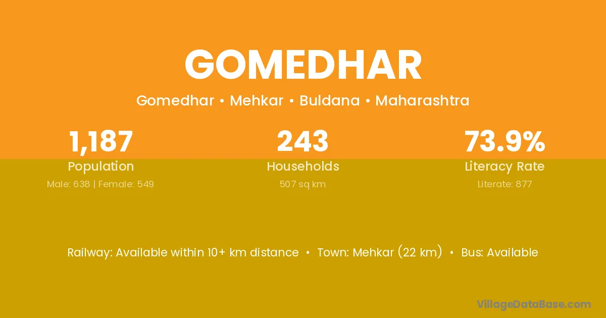 Mehkar (22 km) is the nearest town to Gomedhar village for major economic activities and is located approximately 22 km away.