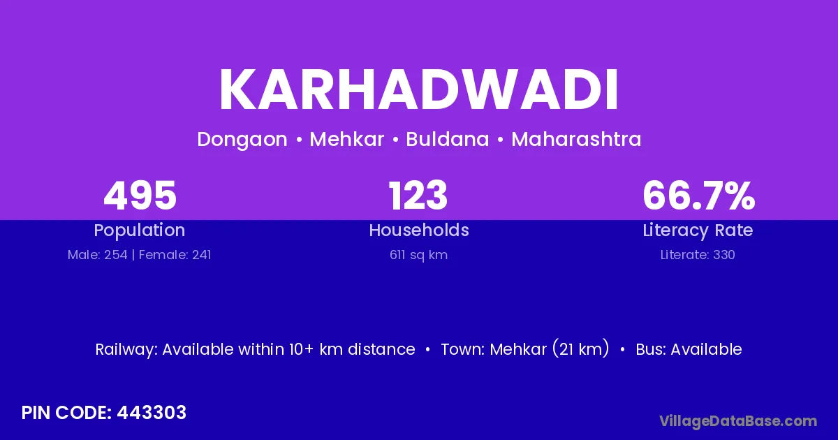 Mehkar (21 km) is the nearest town to Karhadwadi village for major economic activities and is located approximately 21 km away.