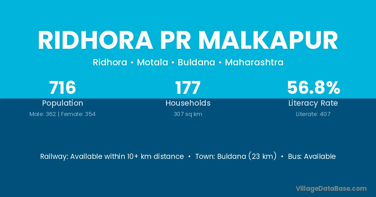 Ridhora Pr Malkapur village has a total population of 716 people, of which 362 are males and 354 are females.