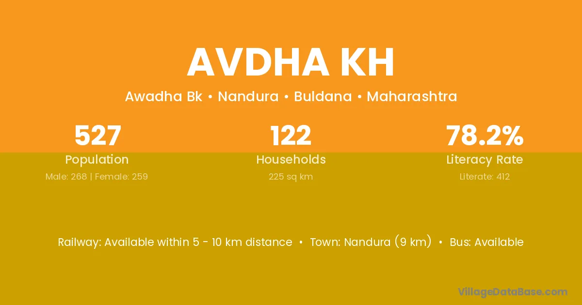 Nandura (9 km) is the nearest town to Avdha Kh village for major economic activities and is located approximately 9 km away.