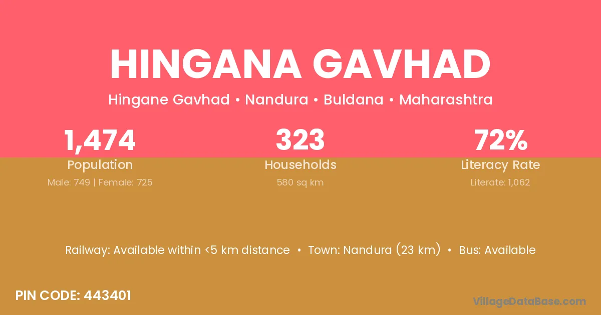Nandura (23 km) is the nearest town to Hingana Gavhad village for major economic activities and is located approximately 23 km away.