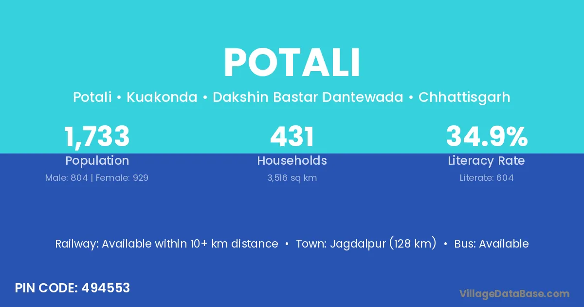 Potali village has a total population of 2,028 people, of which 1,019 are males and 1,009 are females.