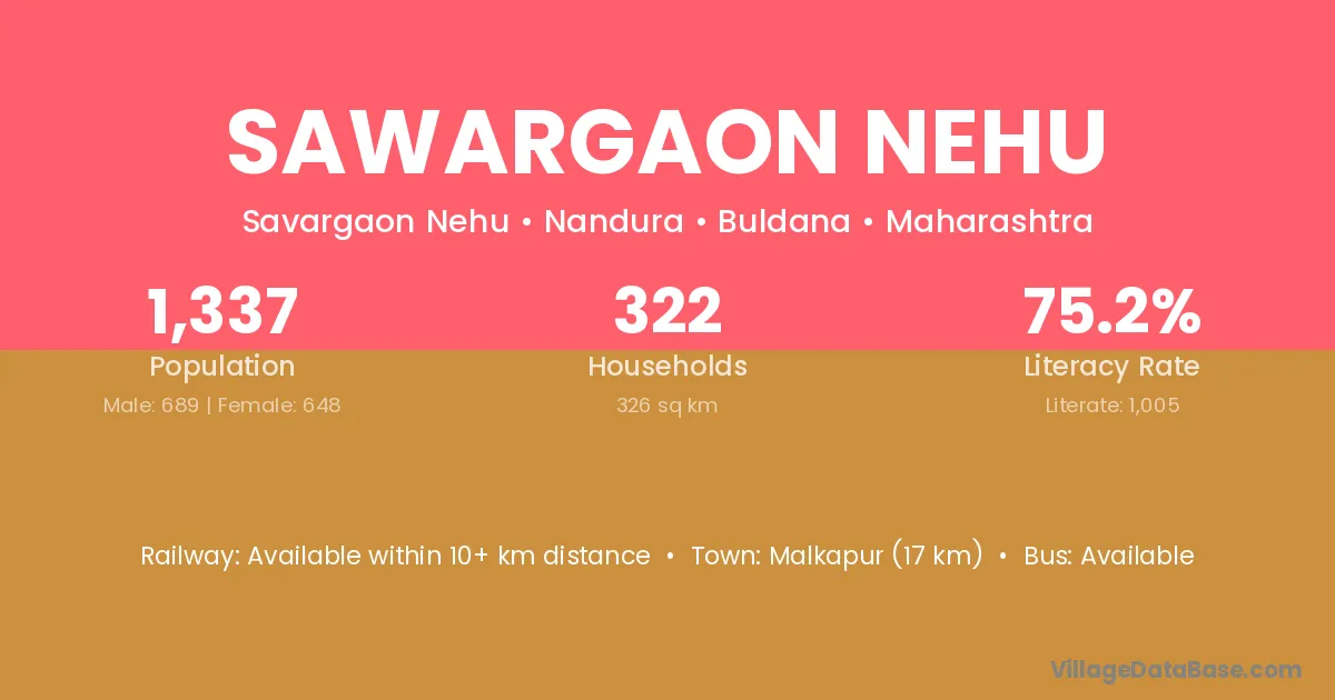 Sawargaon Nehu village has a total population of 1,337 people, of which 689 are males and 648 are females.