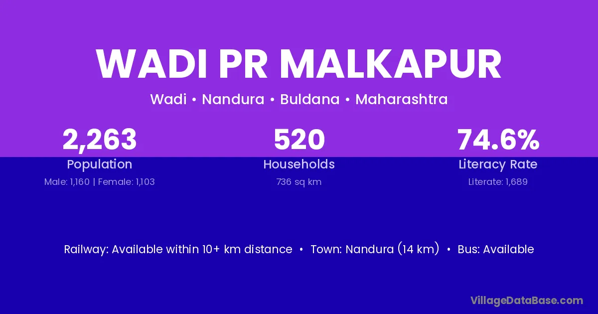 Nandura (14 km) is the nearest town to Wadi Pr Malkapur village for major economic activities and is located approximately 14 km away.