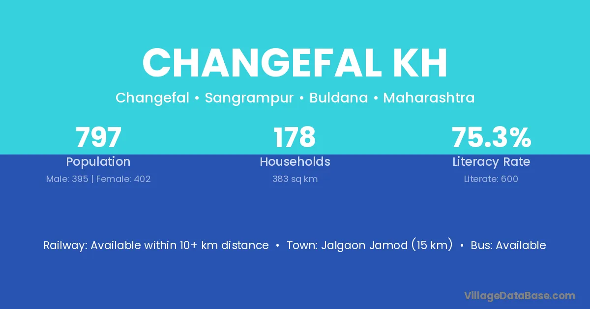 Jalgaon Jamod (15 km) is the nearest town to Changefal Kh village for major economic activities and is located approximately 15 km away.