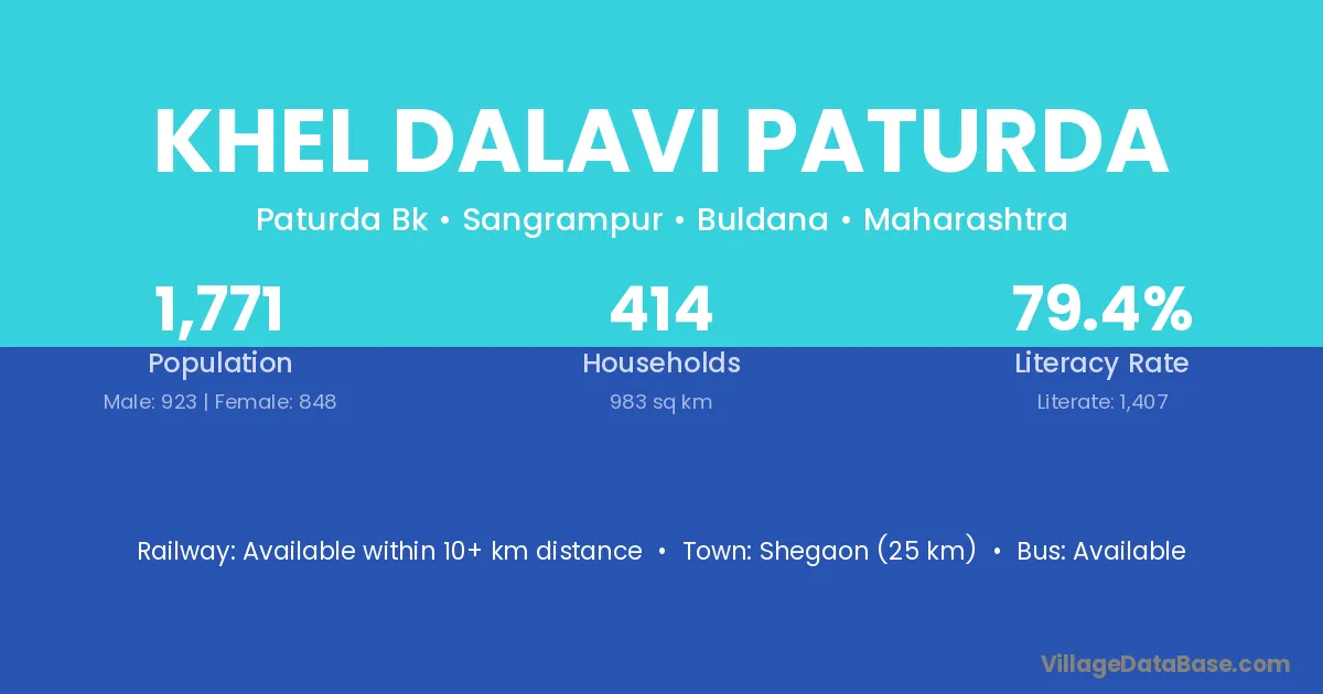 Khel Dalavi Paturda village has a total population of 1,771 people, of which 923 are males and 848 are females.