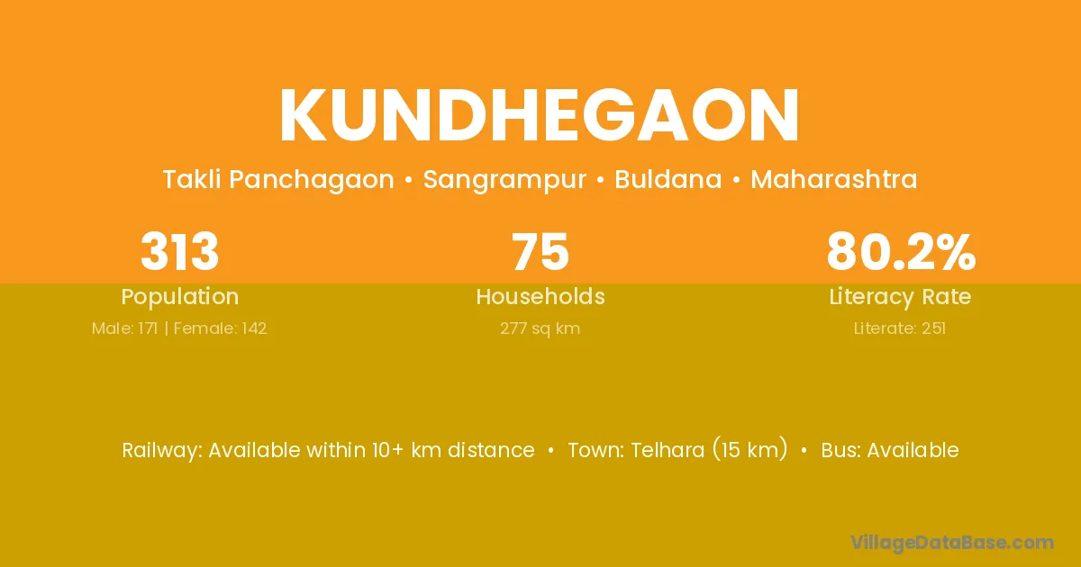 Telhara (15 km) is the nearest town to Kundhegaon village for major economic activities and is located approximately 15 km away.