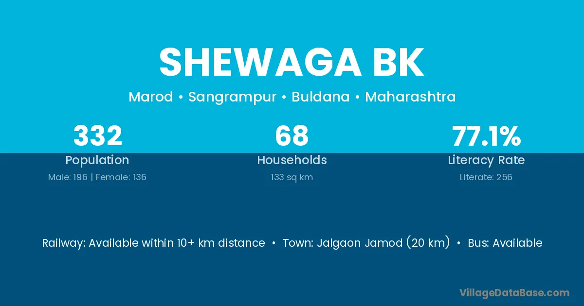 Jalgaon Jamod (20 km) is the nearest town to Shewaga Bk village for major economic activities and is located approximately 20 km away.