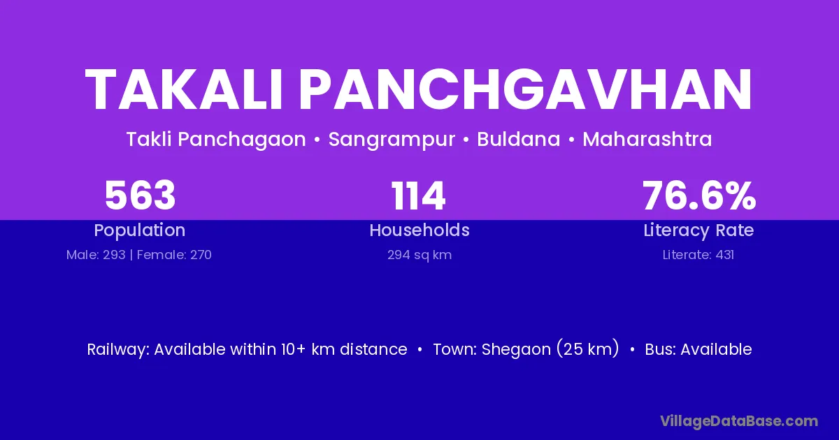 Shegaon (25 km) is the nearest town to Takali Panchgavhan village for major economic activities and is located approximately 25 km away.