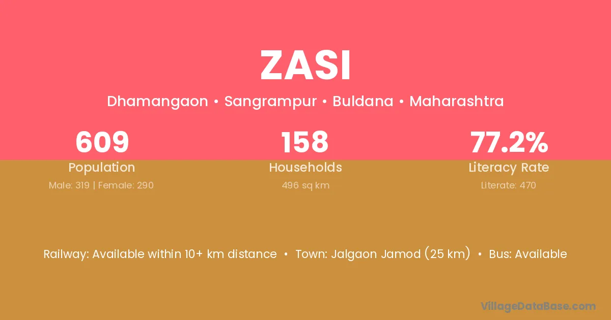 Jalgaon Jamod (25 km) is the nearest town to Zasi village for major economic activities and is located approximately 25 km away.