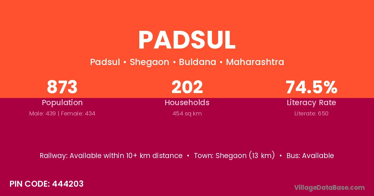 Shegaon (13 km) is the nearest town to Padsul village for major economic activities and is located approximately 13 km away.