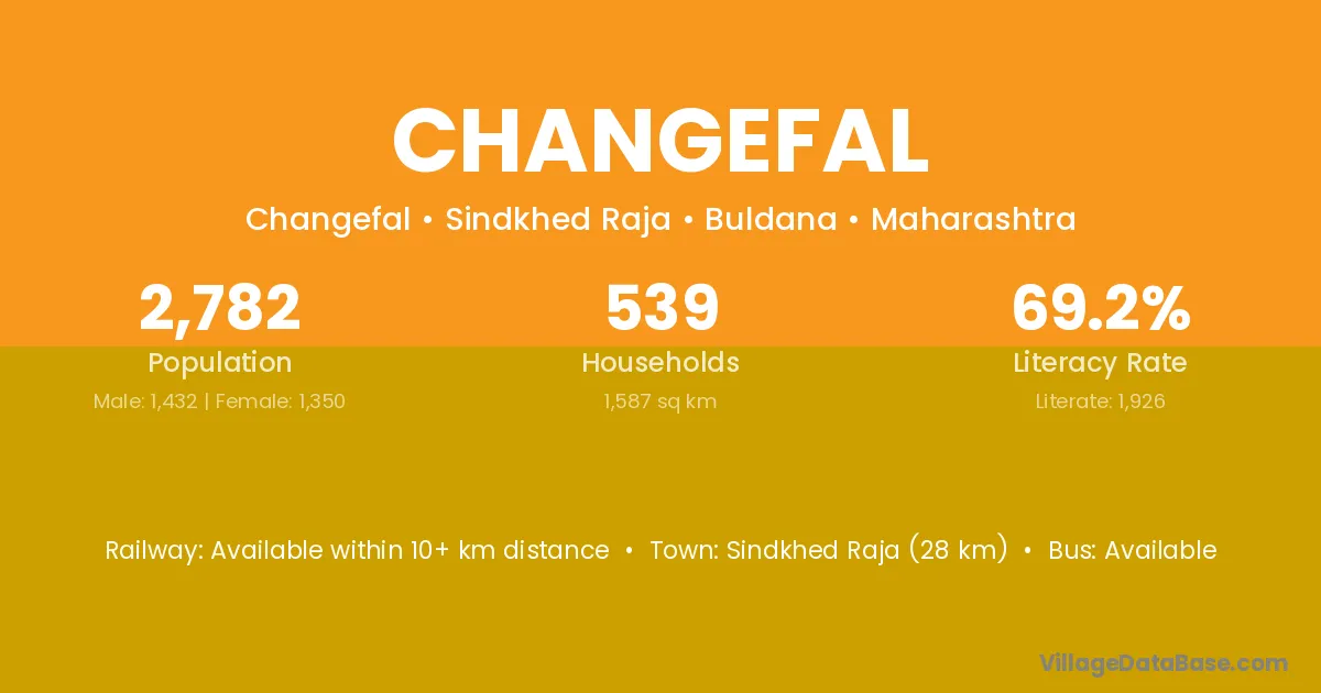 Sindkhed Raja (28 km) is the nearest town to Changefal village for major economic activities and is located approximately 28 km away.